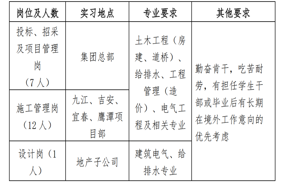 1.业务类管理岗位要求为土木工程(房建、道桥)、给排水、工程管理(造价)、电气等专业的本科及硕士学历的在校大学生。