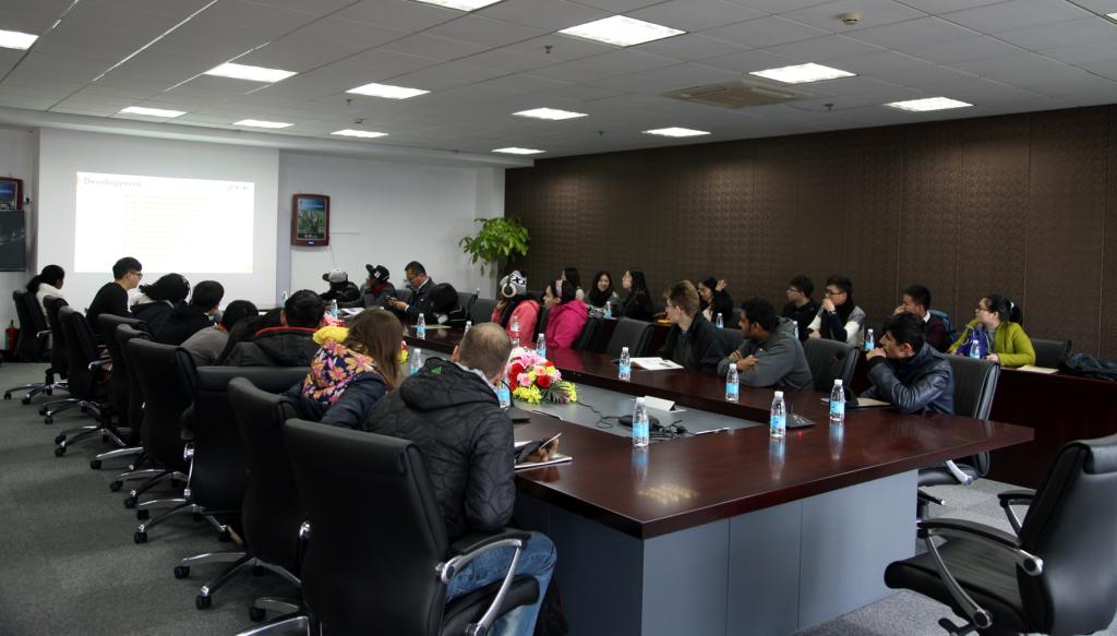 外语系的钱青,向在场的留学生们做了精彩详细的企业发展历史及现况介绍。在这里,留学生们对赛尔企业的发展、av直播建设,有了更加深入全面的认识。看到同样毕业于宁大的优秀人才在这里获得进一步的锻炼平台和成长机会,学生们都纷纷流露出赞许的神情。在聆听过程中,留学生们还积极思考,针对不同方面现场提问,同企业人员展开友好的探讨与交流,也表现出对赛尔集团的兴趣与热情。