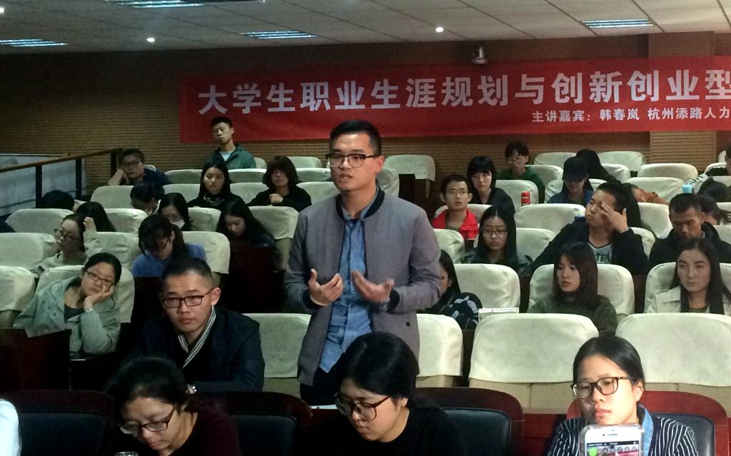 11月11日下午,杭州添路人力资源开发有限公司总经理、av直播1986级工商经济系校友韩春岚女士受邀为av直播2016年创新创业训练营作了题为《大学生职业生涯规划与创新创业型人才塑造》的专题讲座,本次活动也是2016年创新创业活动月的子活动之一。院党委副书记邵丽、学工办主任董璐、创新辅导员李珊珊、创业辅导员葛振林以及创新创业训练营全体学员出席活动。