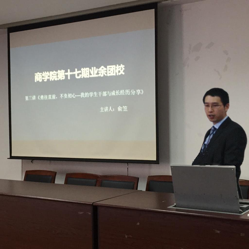 前学生会副主席、09届毕业生、加拿大尼亚加拉地区华人文化协会主席俞笠为团校学员做题为《勇往直前,不忘初心——我的学生干部与成长经历》的分享会。