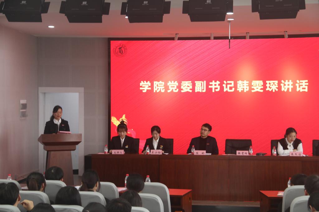 随后,韩雯琛致辞,她首先对上一届团委与学生会完成的工作表示支持与称赞,接着回顾了过去一年商院学子风采,充分肯定了商院学生在创新创业方面的优异表现。最后,韩雯琛对新一届团委与学生会委员提出了几点恳切要求,希望各位学生干部能在思想引领、文化引领、领好学风方面多下功夫,加强思想教育建设,传承宁波帮文化与精神,营造良好的学风氛围。