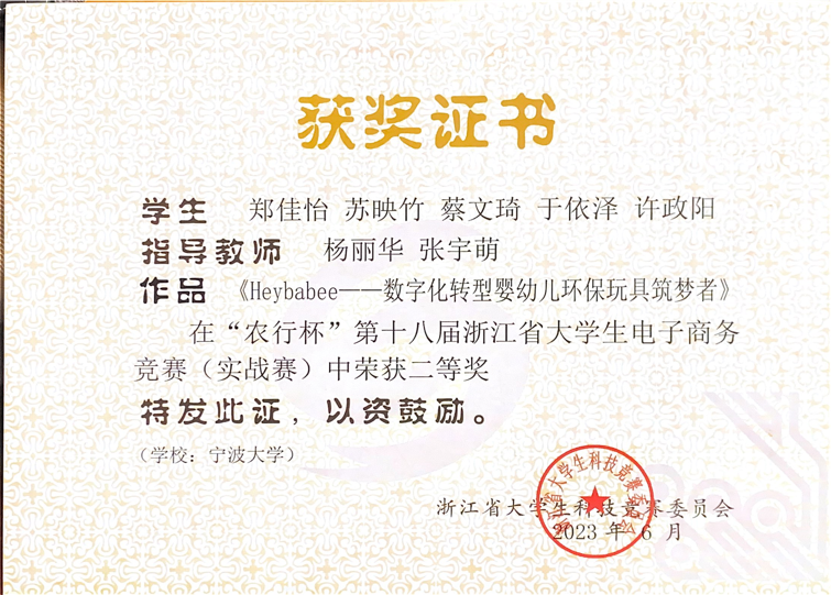 跨境电商微专业由杨丽华、张宇萌老师指导,郑佳怡、苏映竹、蔡文琦、于依泽、许政阳同学参与的作品《Heybabee——数字化转型婴幼儿环保玩具筑梦者》荣获跨境电商—阿里巴巴国际站赛二等奖;由杨丽华、周艳、沈鹏老师指导,刘嘉婕、何静、王宗翔、高如意、周梦楠同学参与完成的《阿里巴巴国际站产品管理的插件设计——易点》获得跨境电商—阿里巴巴国际站赛三等奖。这也是跨境电商微专业学生继首届“典阅杯”全国高校跨境电子商务综合能力大赛全国总决赛斩获佳绩后,第二次在该项赛事中获奖。