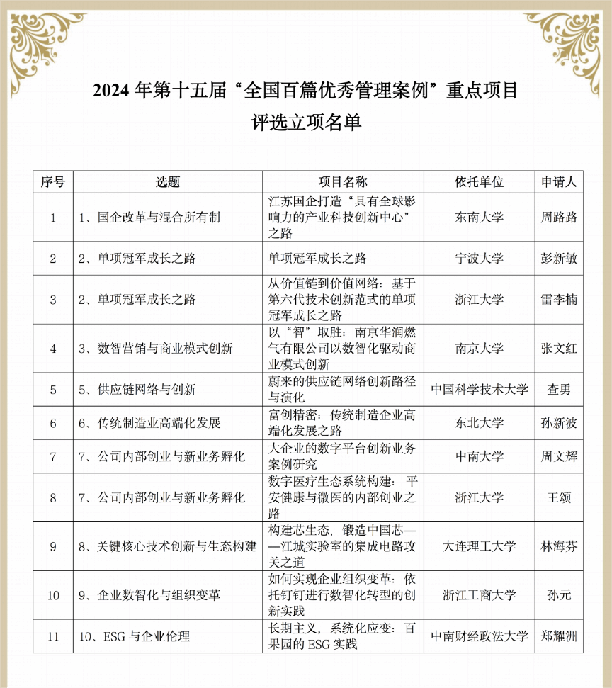 4月18日,第十五届“全国百篇优秀管理案例”评选重点项目立项评审会议在杭州顺利召开,av直播彭新敏教授主持的《单项冠军成长之路》项目申请通过评审,获重点项目立项,这是彭新敏教授团队继在第十届和第十三届评选中取得佳绩后,再次获批立项。