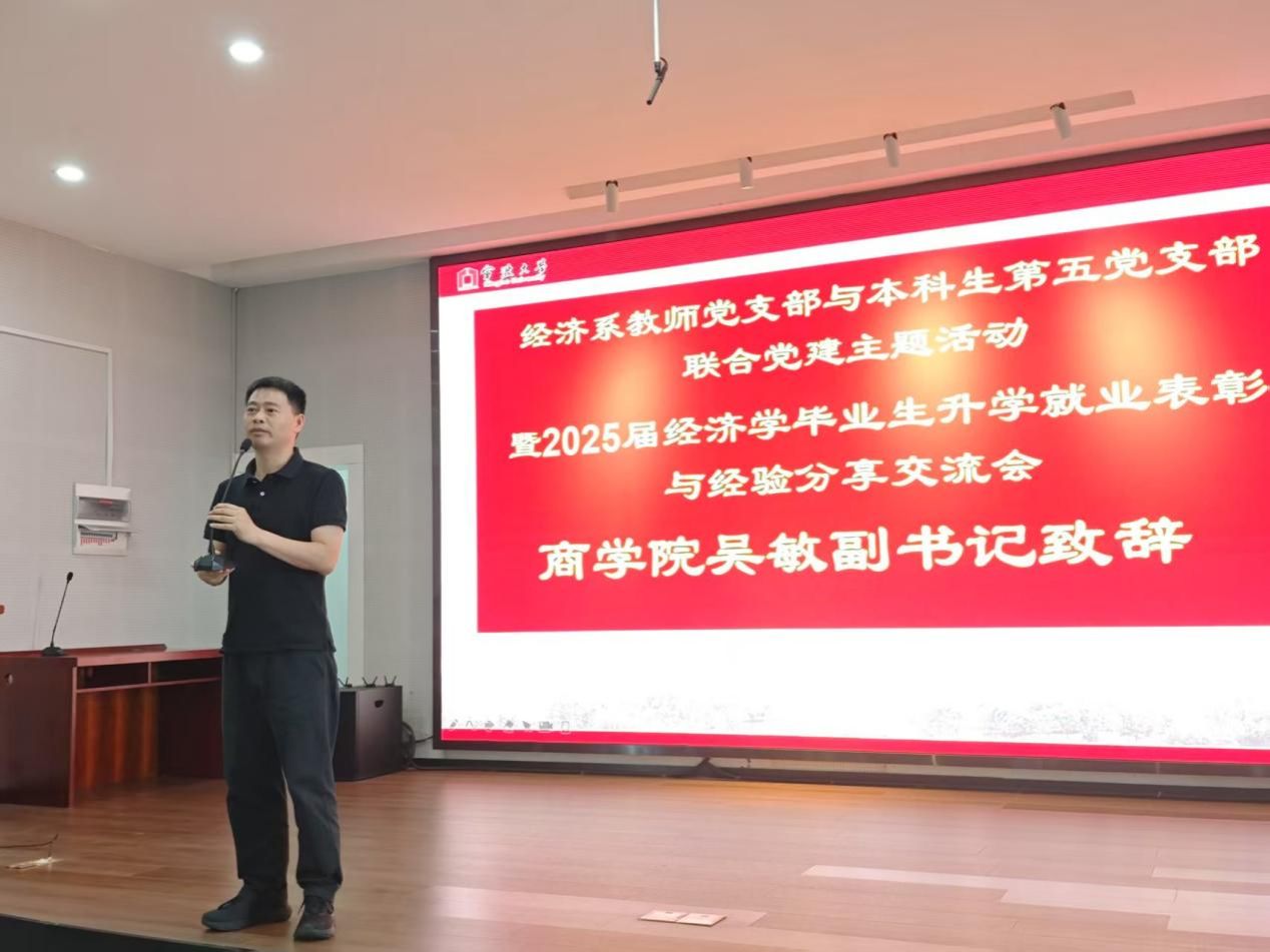 6月18日下午,av直播 501报告厅举行“2025届毕业生升学就业表彰与经验分享交流会”,本次会议由经济系教师党支部与本科生第五党支部共同举办,旨在表彰在升学就业方面取得优异成绩的毕业生,并搭建经验交流平台,助力低年级学生明确发展方向,规划未来。会议由经济系教师党支部书记、系主任徐群芳主持,av直播 党委副书记吴敏受邀参加,经济系教师、2025届经济学毕业班学生以及22级和23级经济学专业学生共同参与本次活动。