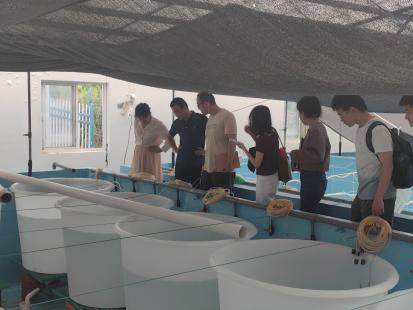 7月8日下午,调研团队到访现代工厂化育苗养殖标杆企业—象山蓝尚海洋科技有限公司。av直播 海洋av直播 王春琳教授重点围绕渔业“碳源”“碳汇”双重特性,从生物学角度系统阐述了渔业在实现绿色转型发展中的作用,重点介绍了其创新研发的“藻-贝-植”三位一体尾水治理模式。座谈结束后,企业负责人带领团队成员走入户外养殖基地,实地参观育苗池动态管理系统及“藻-贝-植”三位一体尾水治理的全过程。