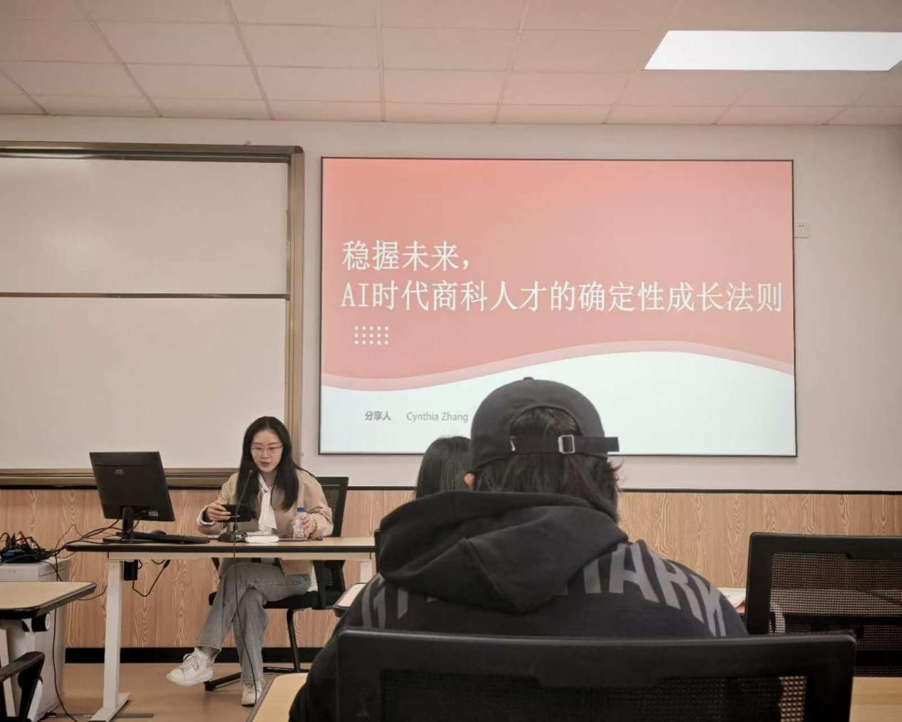 昨日下午(22日),av直播 就业指导中心在曹光彪楼422教室举行AI时代下商科人才培养法则专题讲座。本次讲座特邀高顿教育资深HR张小可担任主讲嘉宾,2023级、2024级本科生代表参加。