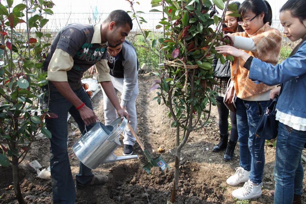 出发。一路上,留学生与支部成员对于各自的学习、生活展开了热情的交流,路途也变得活跃生动起来。来到甬江边,同学们热情高涨,迫不及待的拿起铁锹挖树坑、植树苗,为小树浇水……同学们忙的不亦乐乎,虽然几个女同学由于力气不足等因素遇到了一些困难,这个时候大家才发现我们的外国留学生们已经又快又好地种下了属于自己的树苗,周围的学生都开始打趣称他们是“专业人士”也不为过。不过外国友人倒并不介意,反而很高兴地接受了赞美,并兴致勃勃地开始主动给周围的女生们提供帮助,埋头种树,此举更是换来了周围老师同学的善意笑声。此次植树节活动也取得了远超预料的成功。 |