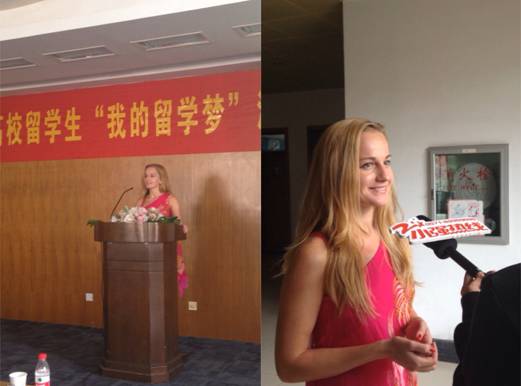 2013浙江省高校留学生“我的留学梦”演讲比赛是浙江省外国留学生第七届“梦行浙江”系列活动的一项重要活动之一,鼓励外国留学生讲述自己的留学故事、与浙江的情缘、发现浙江最美的人、最美的事等,并推荐产生本届“梦行浙江”外国留学生中华才艺展演活动的主持人,增进他们对浙江的感情。比赛邀请了专业的评委老师,全省共有50名高校留学生参加,av直播碧海同学是45号出场。可人的外形、自信的笑容、精彩的留学梦给在场的评委以及观众留下深刻的印象,大家记住了这位喜欢汉语的金发女孩。据悉,碧海还代表我校参加中央电视台的《五月的鲜花》五四晚会。