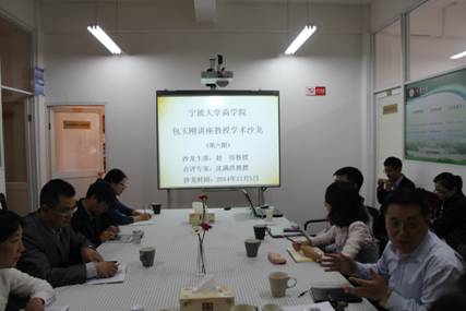 2014年11月5日下午,包玉刚讲座教授学术沙龙(第六期)在严信才楼101室如期举行。本次沙龙由浙江大学赵伟教授主持,av直播 校长沈满洪教授首次应邀参与研讨。av直播 执行院长熊德平教授、科研副院长杨丹萍教授等20余名师生参加了本次沙龙。