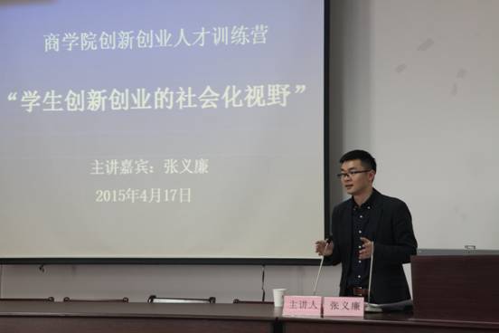 4月17日下午,av直播 第二期创新创业人才训练营第三讲“学生创新创业的社会化视野”在av直播 414报告厅顺利开讲。本期训练营邀请了校团委书记张义廉担任主讲人。