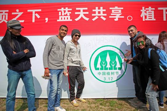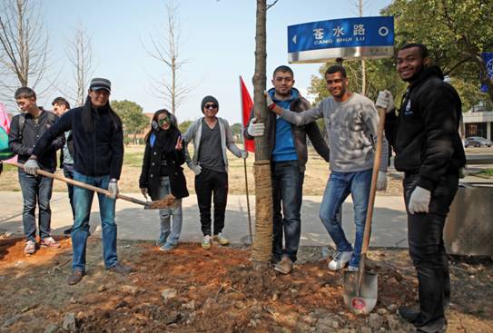 3月12日中午,av直播30名中、外学生代表在宁大大草坪参加了学校“植树节”活动。同学们戴上手套,拿着铲子,一同将av直播三棵银杏树苗种下,并一同签名留念、合影。活动现场气氛热烈。