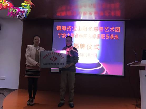 近日,av直播与镇海招宝山阳光慈善艺术团共建的青年志愿服务基地揭牌仪式在镇海社会组织公益服务中心顺利举行。学工办主任董璐、阳光慈善艺术团团长张海江为志愿服务基地揭牌。